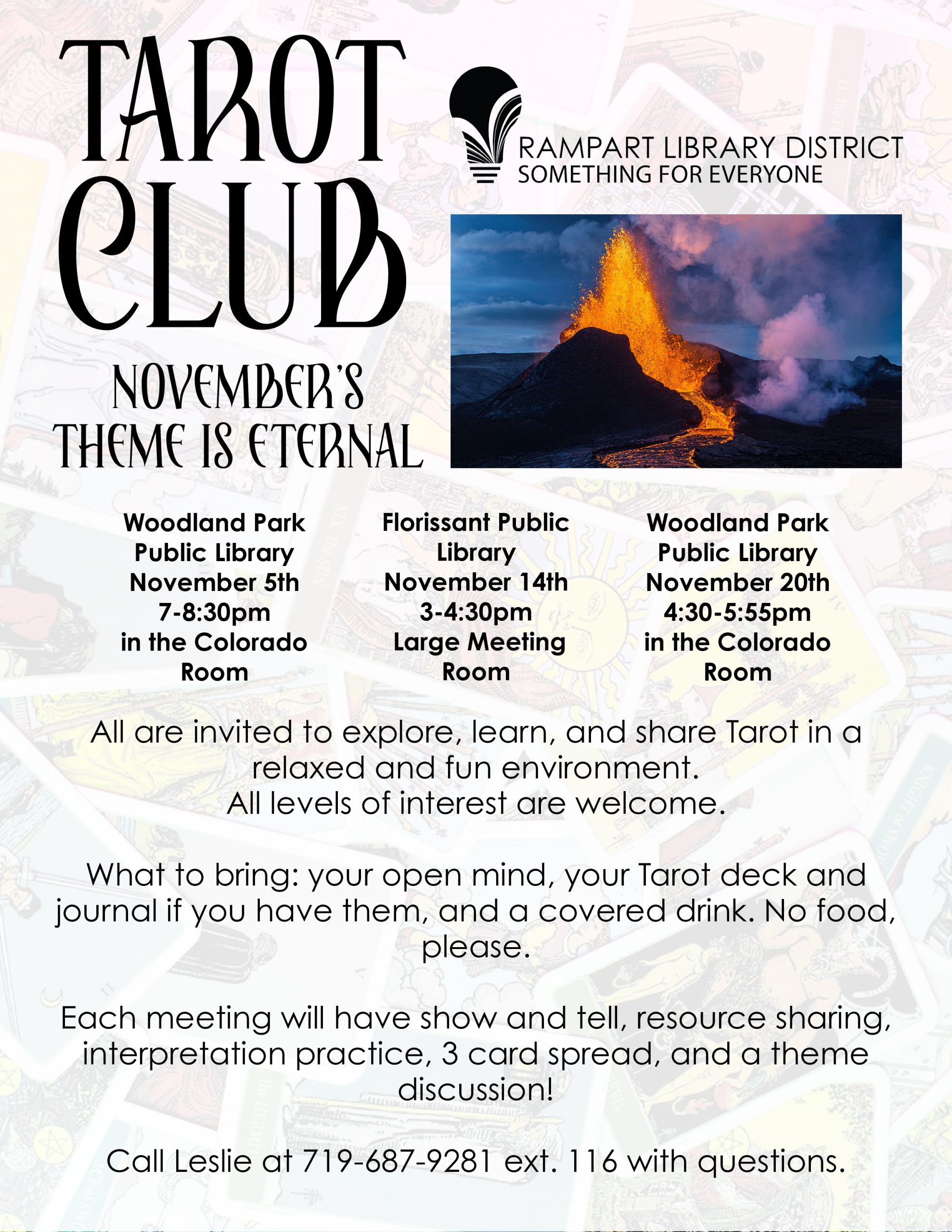 Meets the 3rd Wednesday of the month from 5:45-7:30PM in the Pikes Peak Room at Woodland Park Public Library