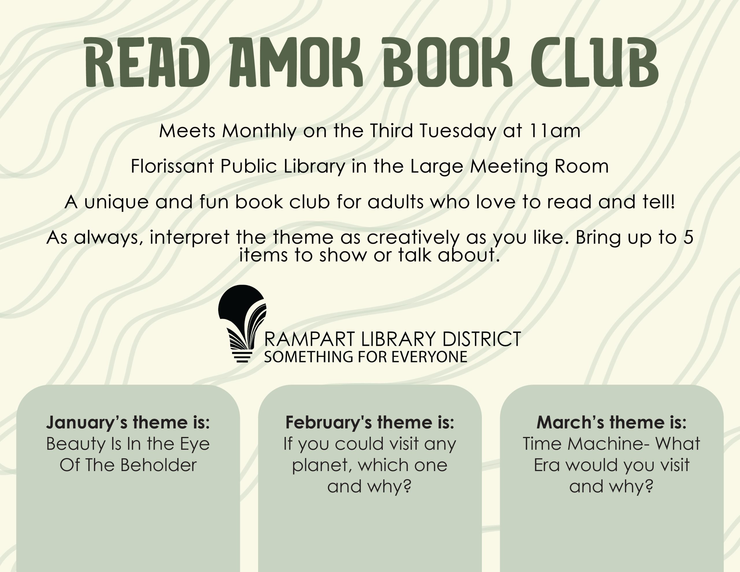 A book club for adults that meets at the Florissant Public Library. Read something you might be unfamiliar with!